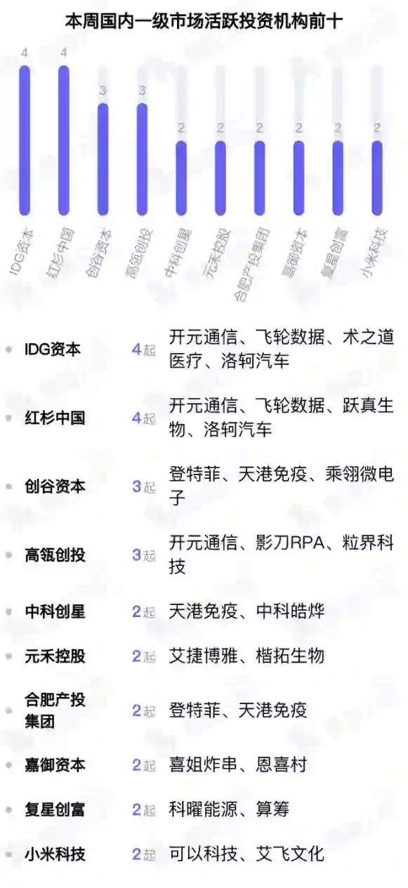 从机构投资活跃度来看,IDG资本、红杉中国、创谷资本在本周创投市场中较为活跃。