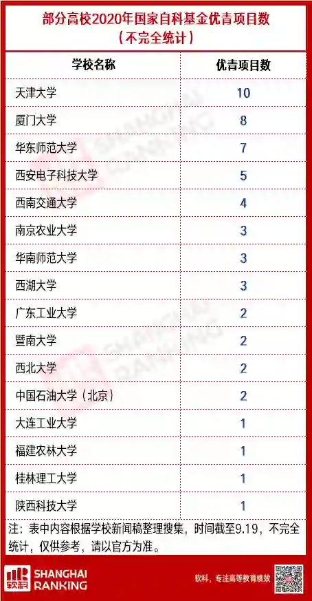 其中大家最关心的优秀青年科学基金项目,目前还未公布完整名单,但已有高校官宣了学校的情况,小编特意搜集汇总,供大家参考(为不完全统计):
