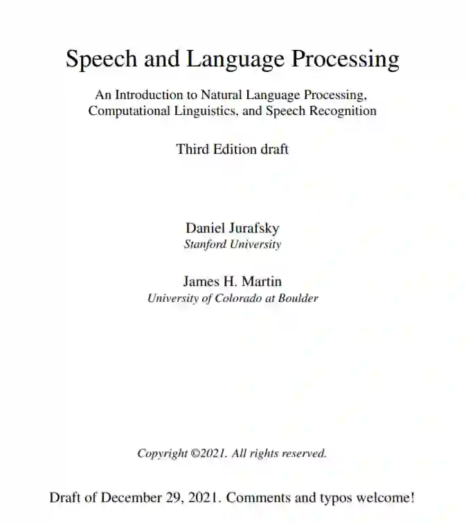 斯坦福大学教授 Dan Jurafsky 与科罗拉多大学波德分校的 James H. Martin 共同编写的《语音与语言处理》是自然语言处理领域里的著名参考书。它不仅可以帮助语言学研究者深入了解语言处理的计算模型和技术,而且还能帮助计算机语言应用开发人员了解更多语言学基础,并帮助语音处理的专业人员了解语言理解和语义学知识。在 2008 年该书推出第二版之后,最近发布了最新版,共有26章。