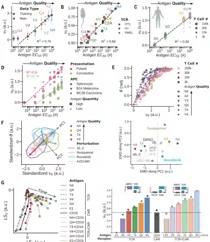 ( A ) 在所有 OT-1 抗原上测试隐空间的数学模型得到与它们的等级相关的v 0测量值(由功能性剂量反应的 EC 50定义。(B到D)从OT-1 T细胞中学习的抗原编码产生准确的v 0排序与不同的小鼠TCR转基因T细胞(B)人类TCR转基因T细胞(C)和OT-1 T细胞响应组成性表达抗原的肿瘤 (D)。( E ) 抗原编码在 ( v 0 ,θ) 空间。( F ) 左:抗原编码 ( v 0 ,θ)在各种分子扰动下的 T 细胞活化。右图:单个抗原的Earth mover’s distance(EMD)。PC1 捕获抗原质量的变化 (EMD2 = 0)。尽管大多数分子扰动只是降低了表观抗原性(EMD1 < 0,EMD2 ≈ 0),但 JAK 抑制剂(AZD1480 和 ruxolitinib)严重影响 T 细胞活化(EMD2 < 0),而 TLR7/8 激动剂瑞喹莫特增强了它(EMD2 > 0) . ( G ) 抗 CD19 CAR-T 细胞(左)的抗原编码揭示了细胞因子反应的弱激活和拮抗模式(右)。