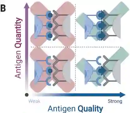 评估抗原质量通常涉及测量触发50%的最大免疫反应(EC50)的抗原水平。然而,抗原质量(antigen quality)应该被定义为一种绝对属性,因为大量的弱抗原(higher quantities of weak antigens)在功能上与少量的强抗原(low quantities of strong antigens)并不能简单的画等号[1]。