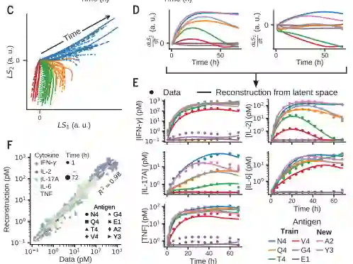(D)不同抗原质量的隐空间轨迹示例。(E和F) 从隐空间轨迹对细胞因子时间序列的非线性重建产生了与实验数据的准确拟合(E)证明了抗原编码的完整性 [此处介绍了四种肽抗原:EIINFEKL(E1)、SIIGFEKL(G4)、 SIYNFEKL(Y3) 和 SAINFEKL(A2)] (F)