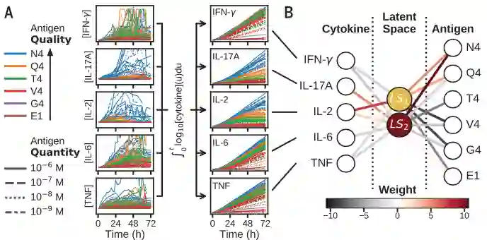 为了帮助解释免疫激活,作者使用机器学习分析和分类这些复杂的动态。使用对数转换的细胞因子浓度随时间的累积积分,作者训练了神经网络,该网络根据抗原序列对细胞因子动力学进行监督分类,与抗原数量无关。