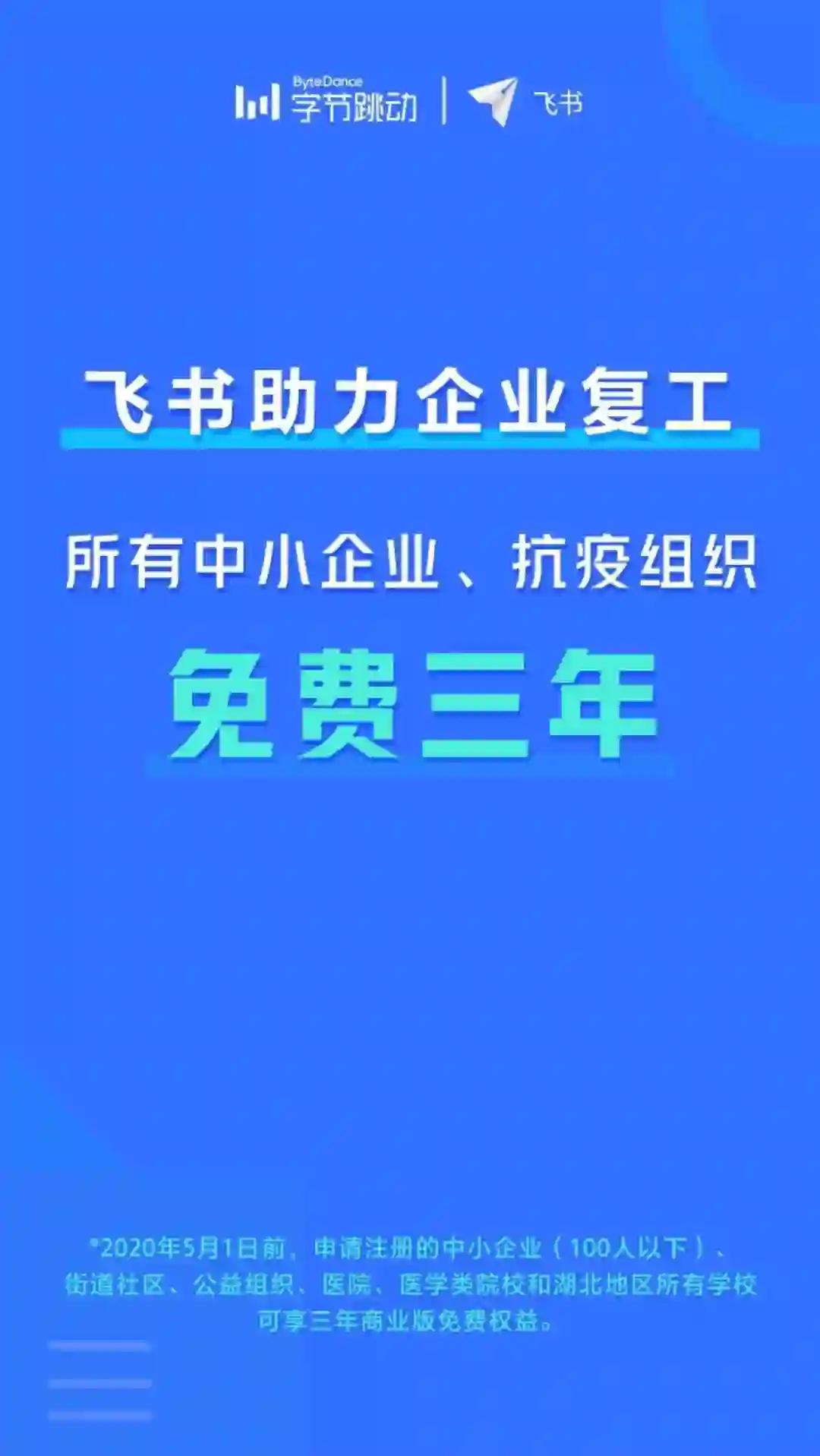 在此,我们也致敬所有维护社会运转,并守护员工健康的组织和机构,对他们表示感谢。因为现在中小企业遇到的发展困难还是蛮大的,所以今天经过非常认真地讨论之后,我们决定给中小企业提供一个额外的福利,在我们通用的功能之外,为他们提供飞书商业版本三年的免费使用权,希望为社会尽一份力。大家各自尽各自的努力,来帮助这个社会发展得更好。