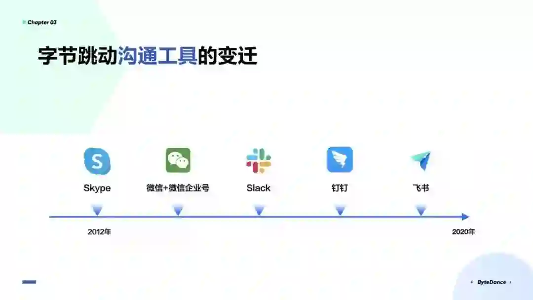 字节跳动更换过多款沟通工具。因为,我们认为,沟通对于信息的创造、分发、流转和消费,至关重要,甚至是公司最重要的一个通用工具。2012年字节跳动成立以来,每个时刻都努力使用当时我们认为最先进、最好用、最适合我们的工具。