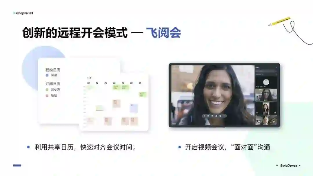 重点说一下我们的开会模式。我们整个公司现在绝大部分的会议,采用的都是“飞阅会”模式,这是“飞书阅读会”的简称。什么意思呢?很多时候我们觉得开会效率太低了,非常浪费时间。传统的开会方式,是一个人上去讲PPT,大家在下面听,有的人听得很懂,有的人听得不懂,有的人觉得讲得慢,有的人觉得讲得快,效率很低。