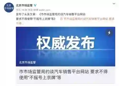据北京市市场监督管理局官方微博消息,针对近期部分汽车销售平台网站以“无需摇号上京牌”等内容为噱头开展皮卡等轻型微型货车营销的情况, 4月10日,市市场监管局约谈了车讯网、卡车之家、凤凰汽车、爱卡汽车、汽车之家、百度贴吧、汽车江湖、顺义在线等本市8家主要汽车销售平台网站,要求这些网站不得以各种形式发布含有“不摇号上京牌”、“无需指标,不排队不轮候”等诱导式宣传内容。