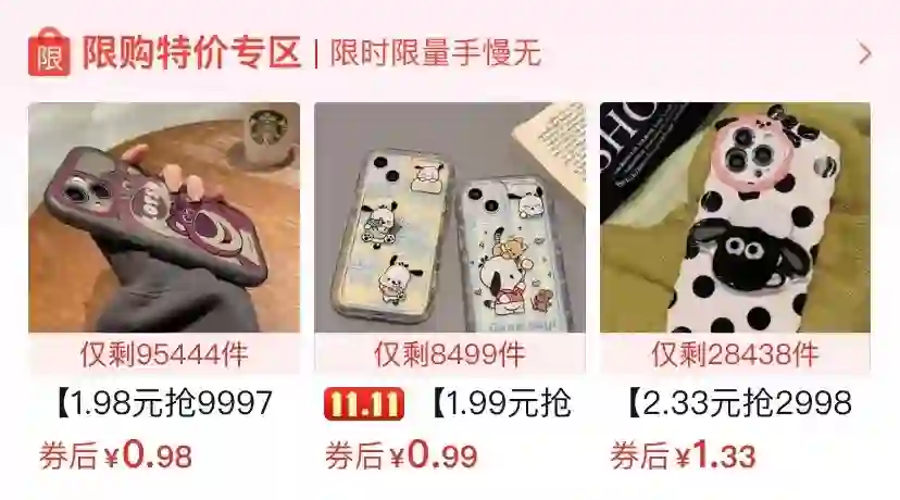 上文提到的话术就源自微信视频号的直播间,除此之外,拼多多的“9块9特卖”、京东的“券后9.9”和抖音极速版的9块9特价频道都很相似,淘宝的天天特卖和9块9包邮的模式也大同小异。