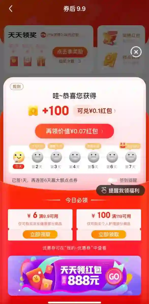 同时,在如何维持消费者的购买热情方面,不少平台正在尝试不同的玩法探索。京东在券后9块9专区中设置了签到兑换金币和优惠券的功能,连续签到七天奖励会随之增加。这种方式能够保持消费者对特价专区的关注度,也能让商品获得更长的曝光时间。