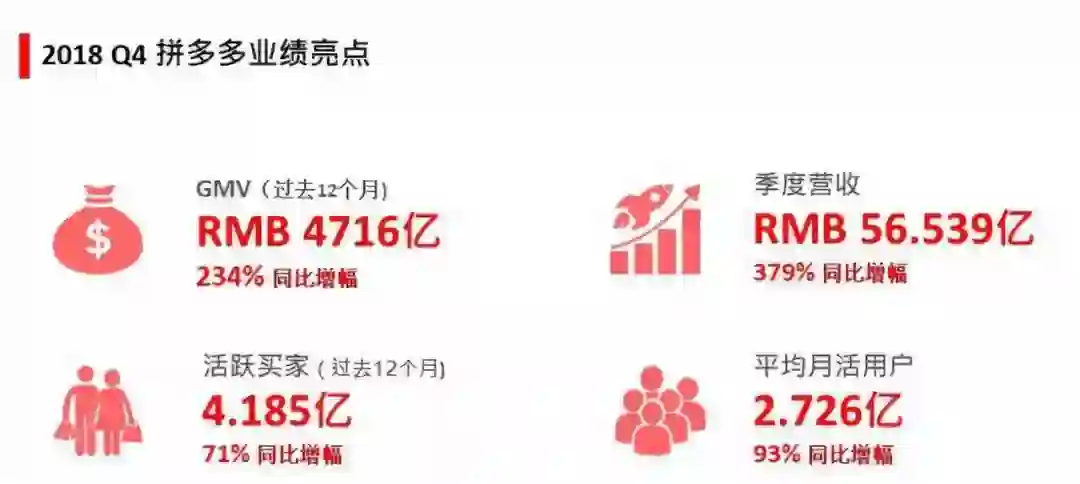 北京时间3月13日,新电商平台拼多多发布的2018年第四季度及全年财报显示:2018年,平台GMV达4716亿元,同比增长234%;平台年度活跃买家数达4.185亿,较2017年同期劲增1.737亿;第四季度,拼多多APP平均月活用户数达2.726亿,单季新增4200万,环比增速达18.2%。