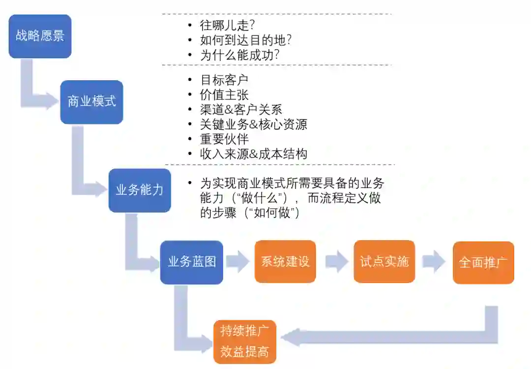 探讨和论证未来的业务模式、场景,结合最佳实践,构建未来的业务蓝图,明确重点转型方向。