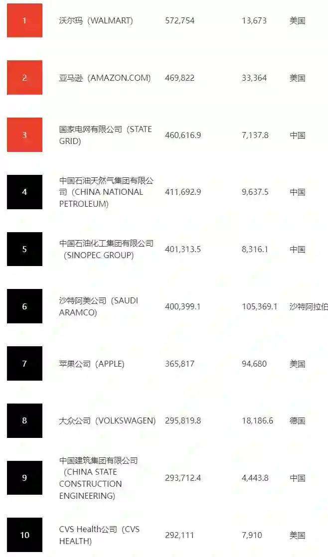 以营业收入计,沃尔玛连续第九年成为全球最大的公司,亚马逊升至第二,苹果公司名列第七。4家中国公司跻身前十:国家电网(第3位)、中国石油(第4位)、中国石化(第5位)和中国建筑(第9位)。
