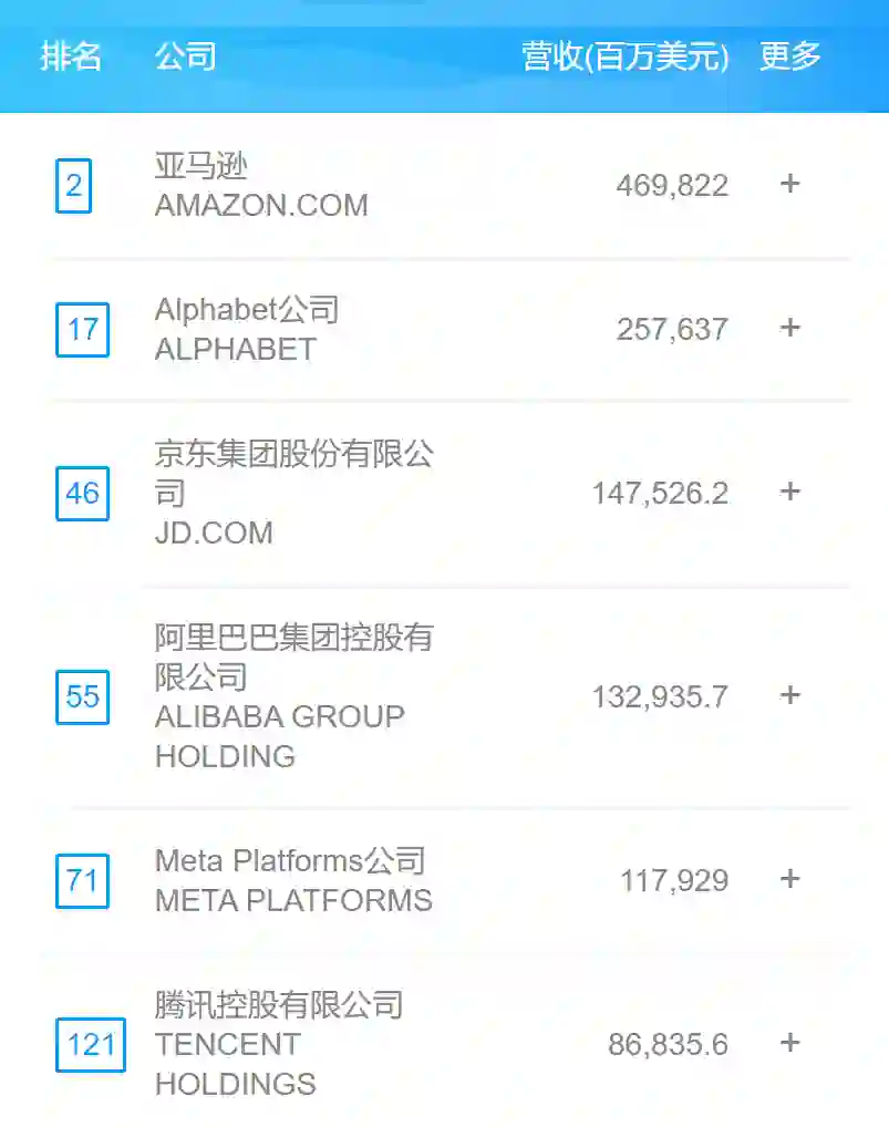 互联网公司虽然声名显赫,但”赢家通吃“的结果是大公司数量并不多。全球上榜的互联网公司一共只有6家,占世界500强总数的1.2%。他们分别是美国的亚马逊、Alphabet、Meta,以及中国的京东、阿里巴巴和腾讯。