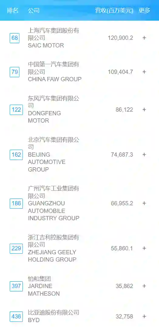 有7家中国汽车企业上榜,分别是:上汽、一汽、东风、北汽、广汽、吉利和比亚迪。值得一提的是,这是比亚迪首次跻身世界500强(第436位),并且是唯一一家专业生产新能源汽车的国产车企。