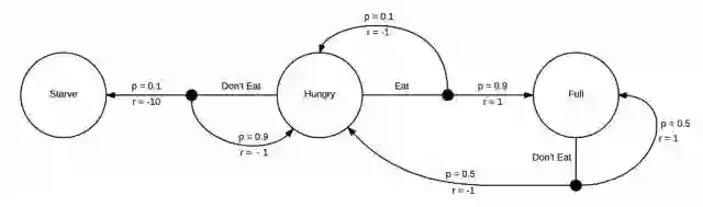 由于这个MDP是十分简单的,我们很容易发现待在一个更高奖励的区域的方式,即当我们饥饿的时候就吃。在这个模型中,当我们处于吃饱状态的时候没有太多其它的选择,但是我们将会不可避免的再次饥饿,然后立马选择进食。强化学习感兴趣的问题其实具有更大更复杂的马尔科夫决策过程,并且在我们开始实际探索前,我们通常不知道这些策略。