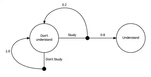 这个MDP展示了学习马尔科夫决策的过程。在最开始你在一个“不理解”的状态中,接下来,你有两个可能的动作,学习或者不学习。如果你选择不学习,则有100%的可能性返回到不理解的状态里。但是,如果你选择学习,只有20%的可能性让你回到最开始的地方,即80%的可能性变成理解的状态。