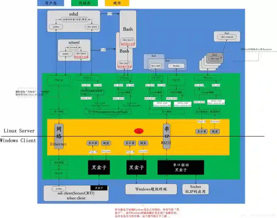 /dev目录下的各种tty,ptmx,pts/X,console等等这些是令人混淆的根源,其实理解这些是有窍门的,记住它们只是操作某种终端设备的设备文件而已,这是UNIX风格的延续,这些设备文件对应的真实设备也就那么几种,比如显示器键盘套件,串口对面的超级终端,伪终端对面的SSH,Telnet等等。然后试着画出一个上面的图,基本就理清楚了。