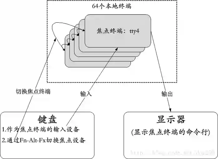 为什么会有63个终端这么多呢?毕竟显示器只是一个单独的显示设备,键盘往往也只有一个,但Linux内核有能力知道现在该干什么,所以事实上Linux内核在初始化时会生成63个本地终端,通过键盘上的Fn-Alt-FX(X为1,2,3…)可以在这些终端之间切换,每切换到一个终端,该终端就是当前的焦点终端,比如说,你按下了Fn-Alt-F4组合键,那么此时第4个终端就是焦点终端,即/dev/tty4就是焦点终端设备。