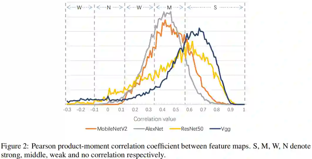 正如已有网络剪枝技术所提,CNN中的卷积核存在相关性。作者给出了不同网络中特征的distribution of Pearson product-moment correlation coefficient,见下图。模型剪枝技术尝试通过压缩的方式降低相关性,然而难以压缩轻量型网络中的相关性。作者认为这种相关性对于性能保持很重要,因为他们需要通过协同方式得到噪声不相关特征。