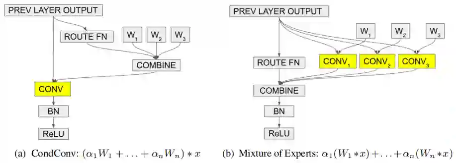 CondConv等价于多个静态卷积的线性组合,见上图b。因此它具有与n个专家同等的容量,但计算更为高效。而这其中最关键是:加权参数