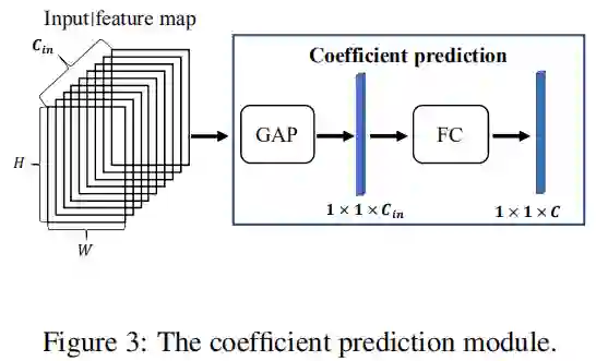 上图给出了作者所提动态卷积的整体框架。它包含系数预测模块与动态生成模块。该系数预测模块是可训练的并用于预测固定卷积核的融合系数;动态生成模块进一步利用所预测的系数生成动态卷积核。所提方法容易执行且“即插即用”,可轻易嵌入到现有网络中。