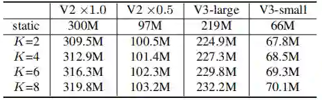 相比静态感知器,动态感知器具有更大的模型。它包含两个额外的计算:(a)注意力权值计算;(2)动态权值融合。尽管如此,这两点额外计算相比感知器的计算量可以忽略: