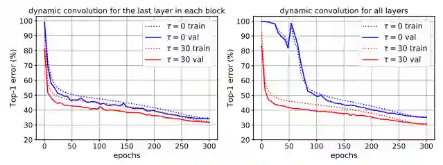 训练深层动态卷积神经网络极具挑战,因其需要同时优化卷积核与注意力部分。下右图蓝线给出了DY-MobileNetV2的训练与验证误差,可以看到收敛较慢且性能仅为64.8%还不如其静态卷积版本的65.4%。