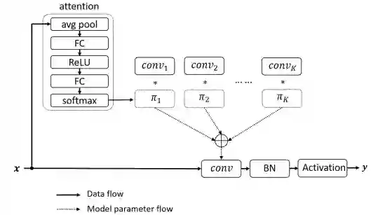 作者提出的动态卷积不会提升网络深度与宽度,相反通过多卷积核融合提升模型表达能力。需要注意的是:所得卷积核与输入相关,即不同数据具有不同的卷积,这也就是动态卷积的由来。