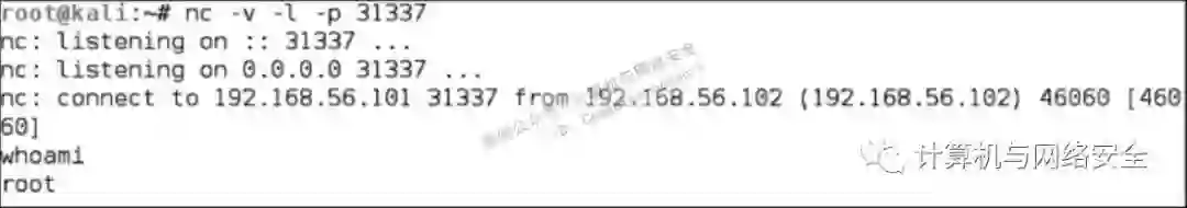 在执行payload之前,我们还要在测试主机上启动netcat的监听服务,以受理被测主机发起的连接。