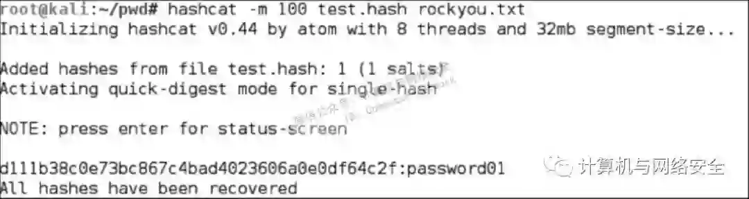 上述信息表明这个值是SHA-1型的哈希值。接下来,我们可以使用Hashcat程序破解这个哈希值中的信息。