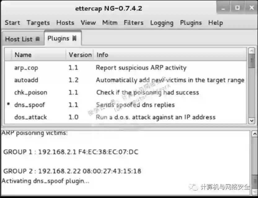 (8) 在菜单里依次选中 Plugins | Manage the plugins,然后双击(激活)dns_spoof插件(见图27)。