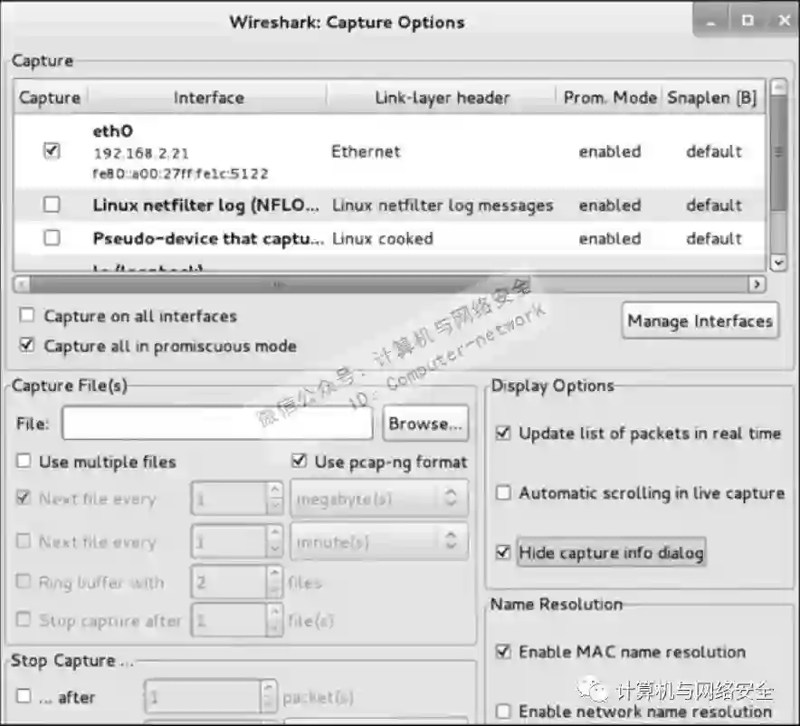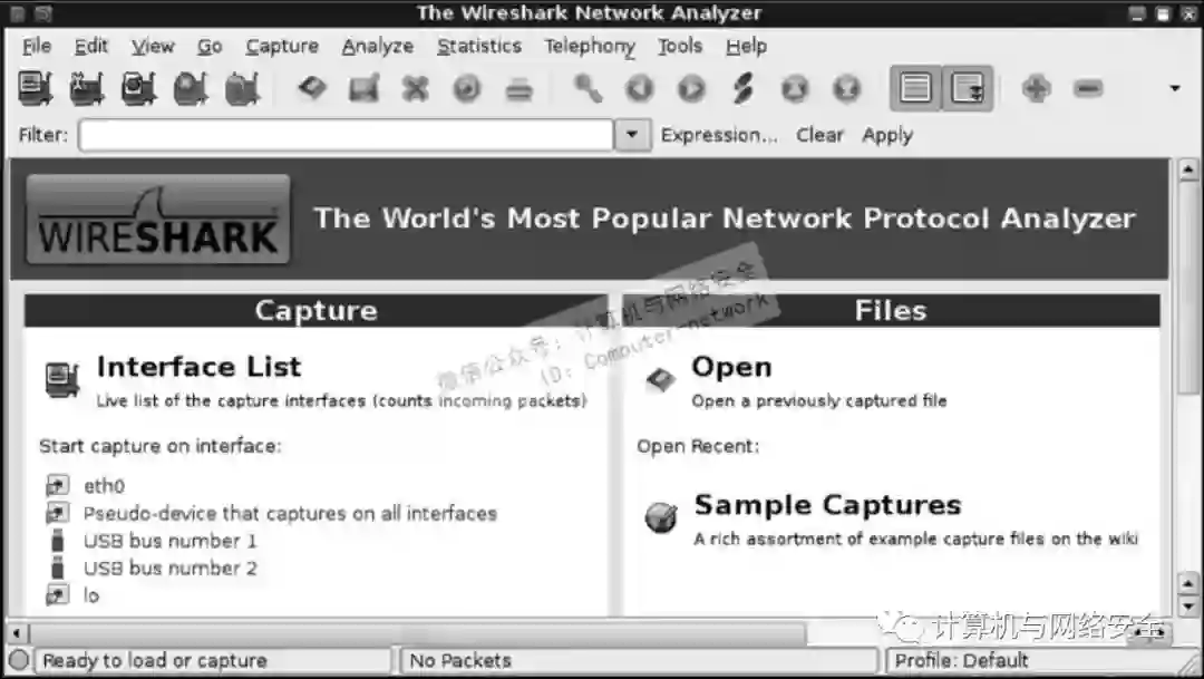 上述指令将启动Wireshark网络协议分析程序。如果要捕捉网络数据,可以在Interface List中选择相应的网卡,如图30所示。