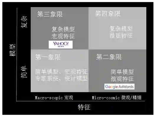 第二象限是简单模型加复杂特征,最成功的典型案例是 Google AdWords。Google AdWords 占 Google 70% 以上的收入,Google 的展示广告也是用的这样的技术,占了 Google 大概剩下的 20% 左右的收入。