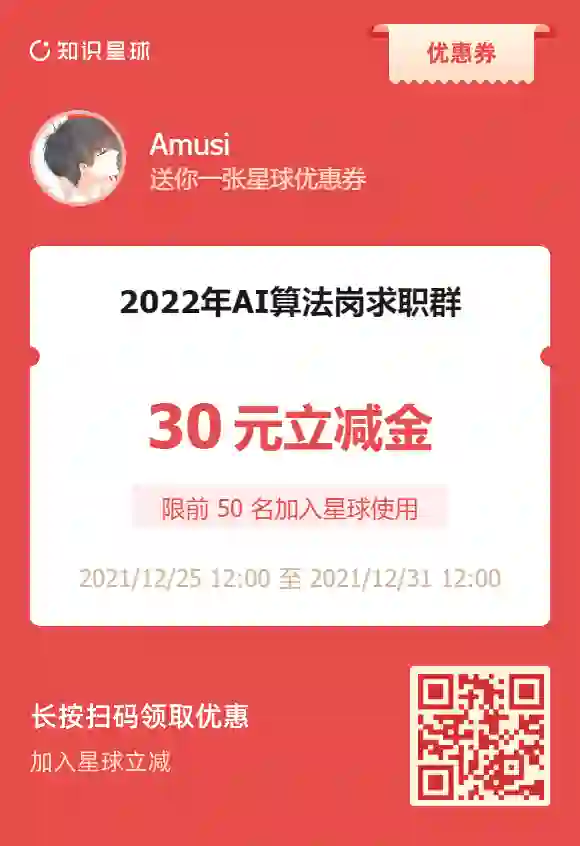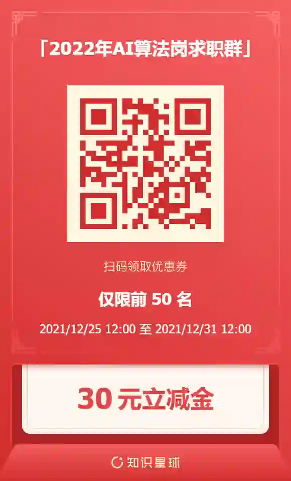 之前分享优惠券就被秒抢!CVer 在此再赠送 50 张 AI算法岗求职群(知识星球)30元优惠券!今年年底最大的优惠力度!今明年和未来几年要找工作的同学们可以抢起来了~注:2022年是针对2022届、2023届,但星球一直不会变(24届及以后都可以在里面),里面的内容和分享永存!