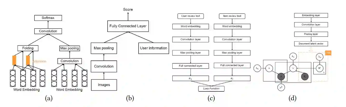 图 6:(a)基于 Attention 的 CNN;(b)个性化 CNN 标签推荐;(c)DeepCoNN;(d)ConvMF。