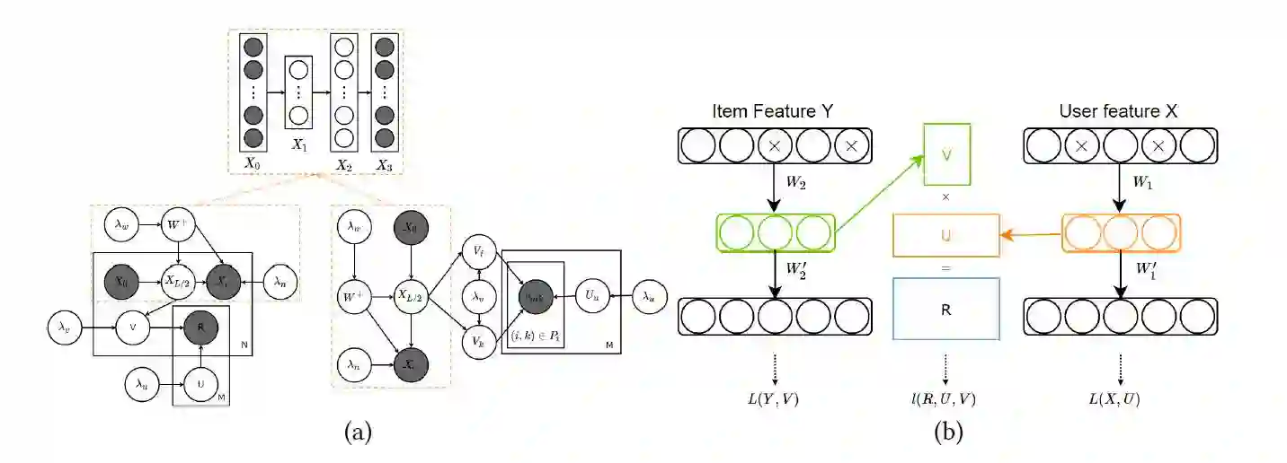 图 5:(a)协同深度学习(左)与协同深度排序(右)的图模型;(b)深度协同过滤框架。