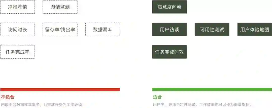 在C端产品中乃至部分B端产品中,我们有很多聪明的办法去衡量一个产品的现状,比如净推荐值,跳出率,任务完成率,可以直接从数据观察到用户流失的环节,方便又客观。但是对于公司内部使用的中后台系统来说,一个是数据样本量少,不一定能准确代表问题;更重要的是,不管体验如何,用户出于完成工作的目的,也必须完成系统的任务,所谓完成率和体验没有必然联系。