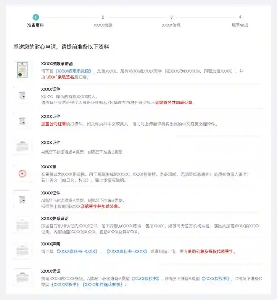 于是,在必要流程前添加了准备资料阶段,列出了所有需要准备的资料,注意: