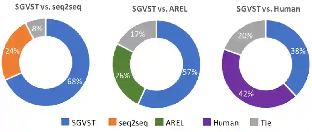 表1显示了不同模型在七个自动评价指标上的性能。结果显示作者提出的SGVST模型几乎在所有指标上都优于其他用MLE和RL优化的模型具有更好的性能,SGVST的BLEU-1、BLEU-4和METEOR得分比其他基于MLE优化的最佳方法分别提高了3.2%、2.5%和1.4%,这被认为是在VIST数据集上的显著进步。这直接说明将图像转换为基于图的语义表示(如场景图),有利于图像的表示和高质量的故事生成。