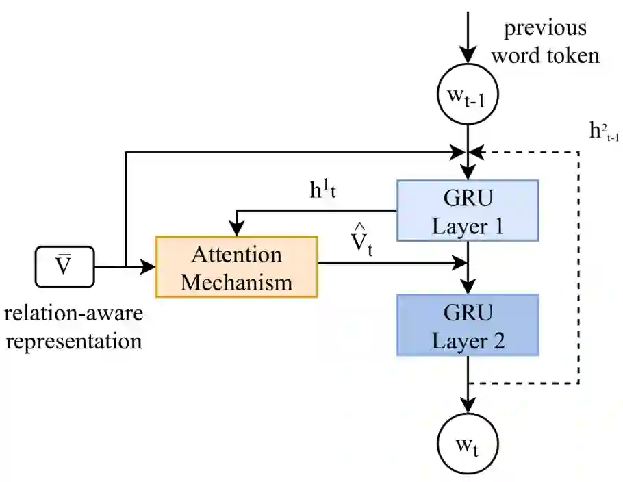 如图2所示,一个男人抱着一个孩子,那么男人和孩子就可以作为图中的节点,他们的视觉关系作为边。接着将场景图通过Multi-modal Graph ConvNet:在图像内的层面,使用图卷积神经网络(GCN)来对场景图中的节点特征进行增强。在跨图像层面,为了建模图像之间的交互,使用时序卷积神经网络(TCN)来沿着时间维度进行卷积,进一步优化图像的特征表示。最后得到了集合了图像内关系和跨图像关系的relation aware的特征,输入到层次化解码器(Hierarchical Decoder)中来生成故事。