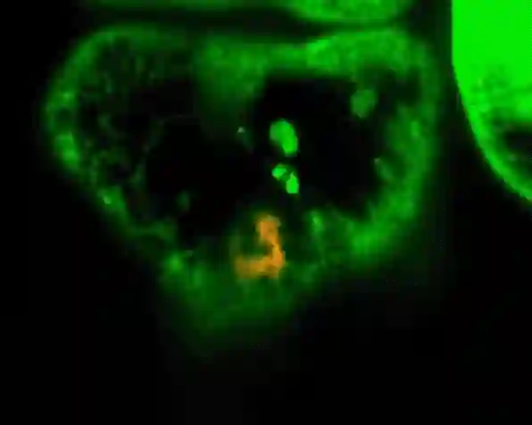 你看,下面就是果蝇身体里脂肪分布的动态图,绿色的是体细胞,橘黄色的是脂肪体。怎么样,小小虫子,也没瘦到哪去吧~