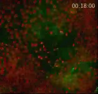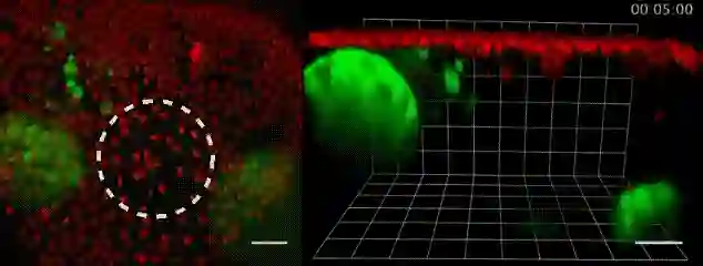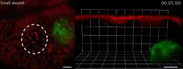 哎~这个事儿有趣了,你看,伤口形成之后,大腹便便的脂肪细胞(绿)就会异常灵活地赶往伤口,用自己健壮的身躯堵住缺损的上皮细胞(红),等到伤口愈合才离开。