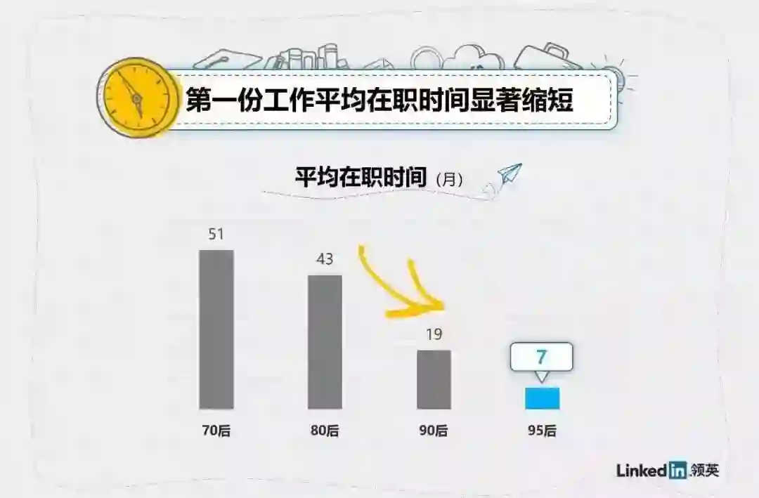 近期,领英发布了“第一份工作趋势洞察”,发现70后的第一份工作超过4年才换,80后则是3年半,而90后骤减到19个月,95后仅在入职7个月后就选择了辞职。