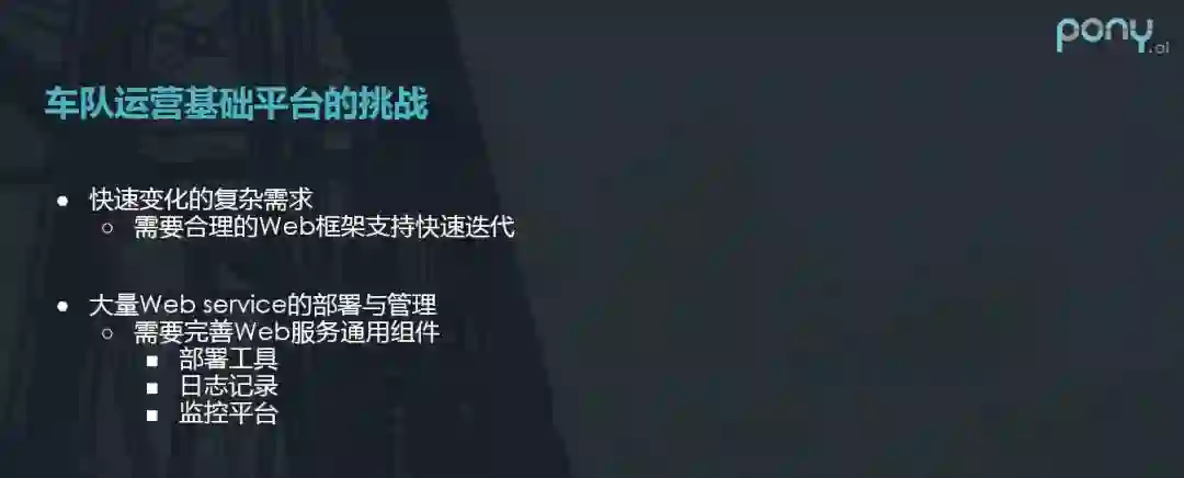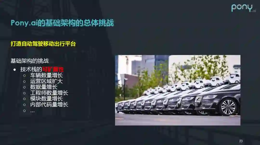 Pony.ai 的目标是打造自动驾驶移动出行平台,我们希望可以在不同的城市,可以提供大规模自动驾驶车辆的运营,那么我们的基础架构会面临以下挑战:
