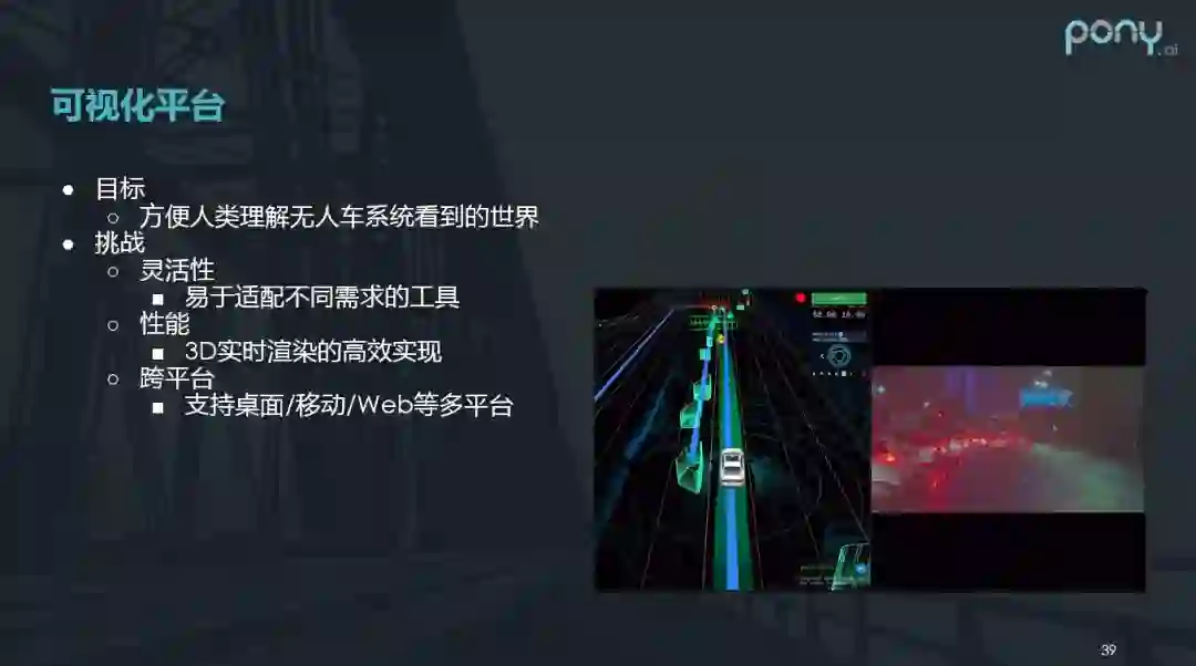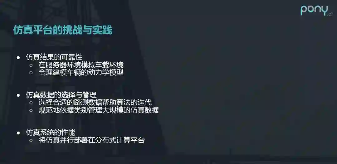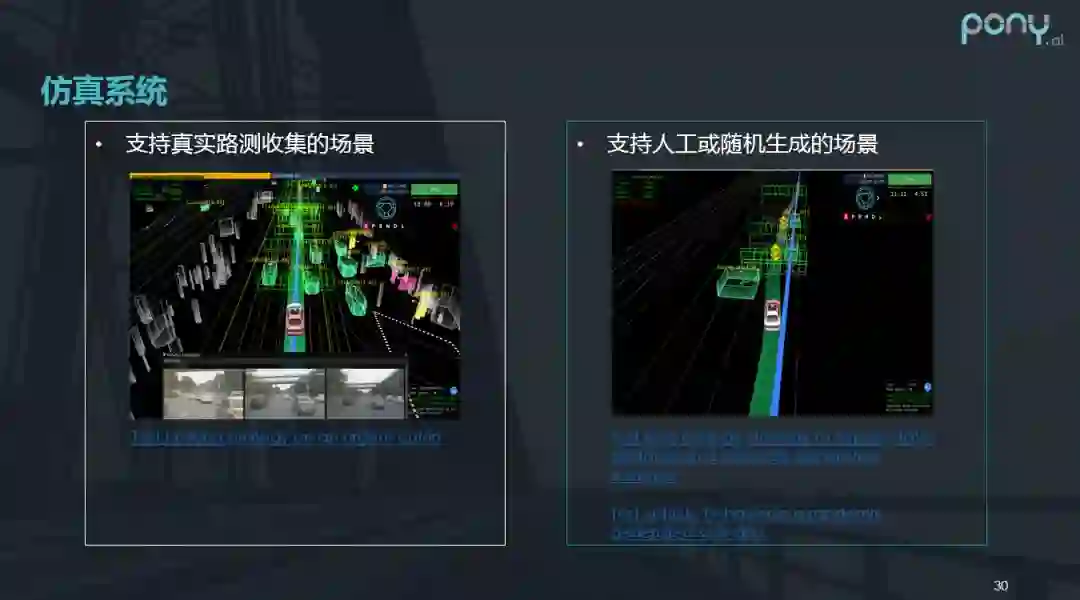大规模仿真平台,Pony.ai 每天至少会跑 30W 公里的仿真测试(很多自动驾驶公司一年跑的里程可能只有百万级别),这点对于自动驾驶测试来说非常重要。