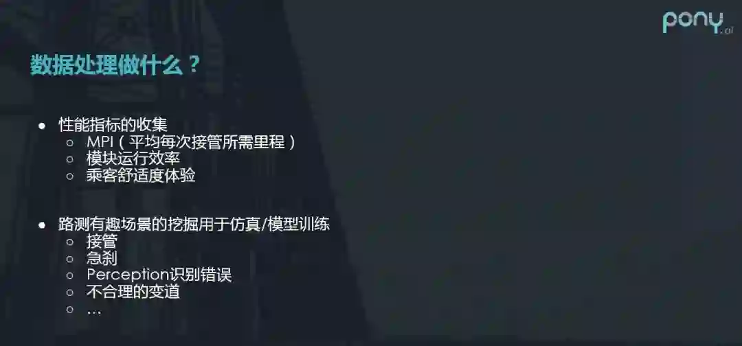 数据处理可以帮助收集性能指标,有 MPI(平均每次接管所需里程)、模块运行效率、乘客舒适度体验等,还有就是路测有趣场景的挖掘,如接管、急刹、感知算法识别、不合理的变道策略等用于模型训练和仿真。