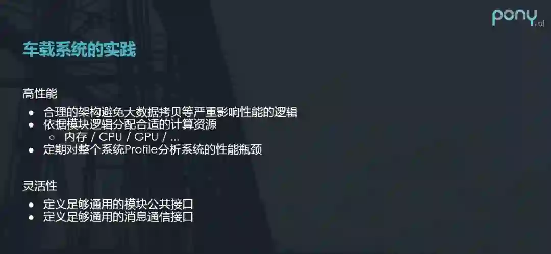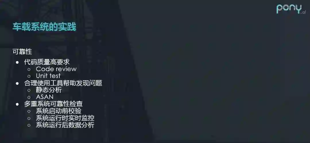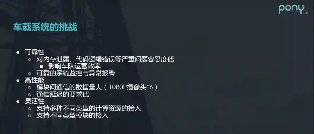 ① 可靠性:车载系统必须足够的可靠,不能有任何的内存泄露、代码逻辑的错位,这种都是零容忍的,一旦发生了这样的事情,对整个自动驾驶系统来说是非常严重的事故,是有可能影响到安全性的,对于 Pony.ai 自动驾驶系统技术的发展来说,安全永远是我们的第一位,所以所有影响安全性的事情,我们都是零容忍的,同时他也会影响车队运营的效率;所以我们还需要系统监控与异常报警,一旦系统出现任何问题,我们需要及时提醒安全员,做出车辆接管的操作。