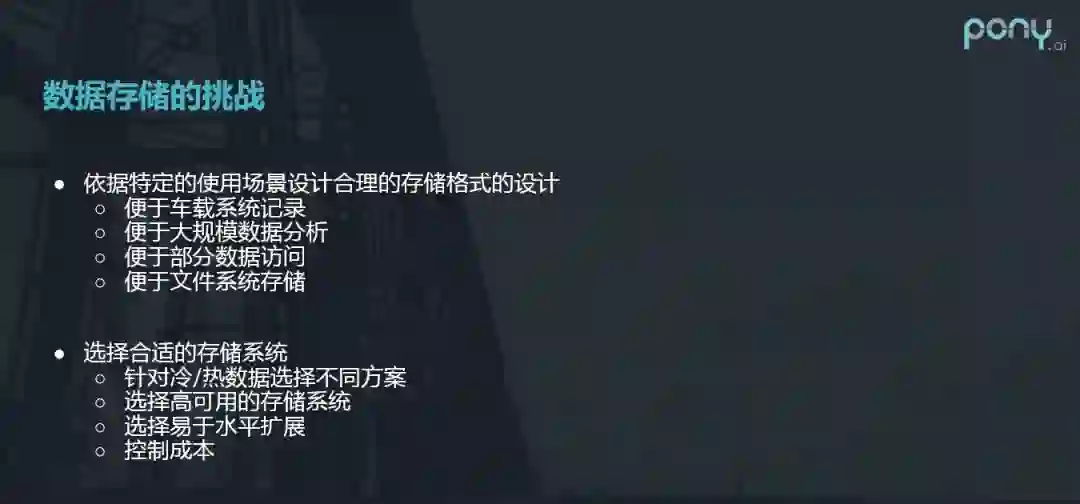 ① 依据特定的使用场景设计合理的存储格式的设计:以便于车载系统记录、大规模数据分析(数据回来之后,需要有方法进行分析,找出有意义的数据)、部分数据访问、文件系统存储(如何高效的利用文件系统)等。