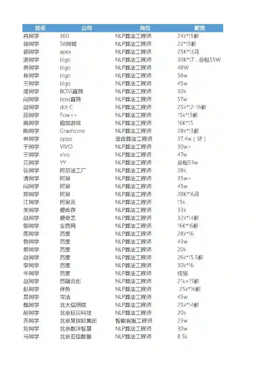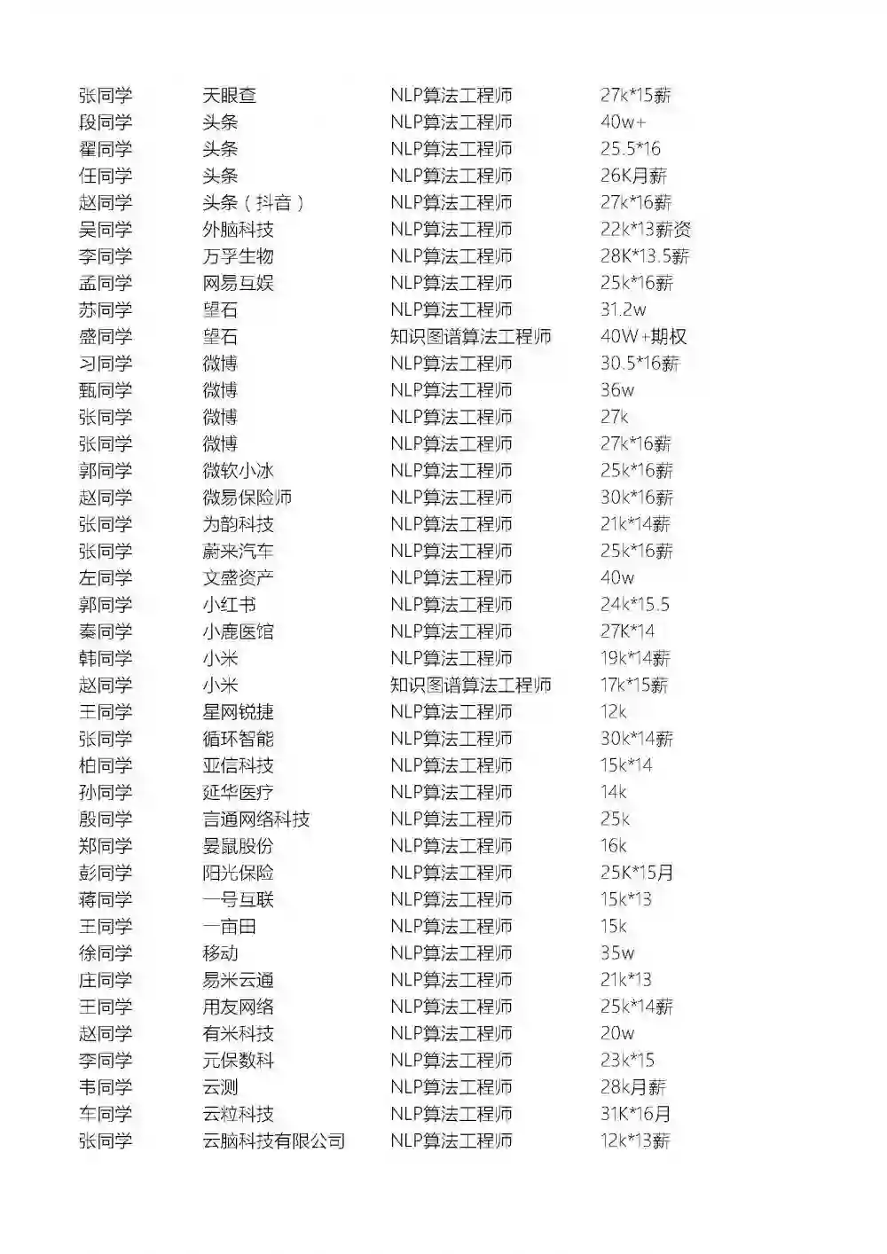 自本课程开设以来,已经有一大批毕业学员入职NLP领域的互联网公司、金融行业、科研院所、创业公司,甚至越来越的的传统行业也开始注重AI技术的应用如何在本行业中创造新的价值。下面是一部分学员的offer情况: