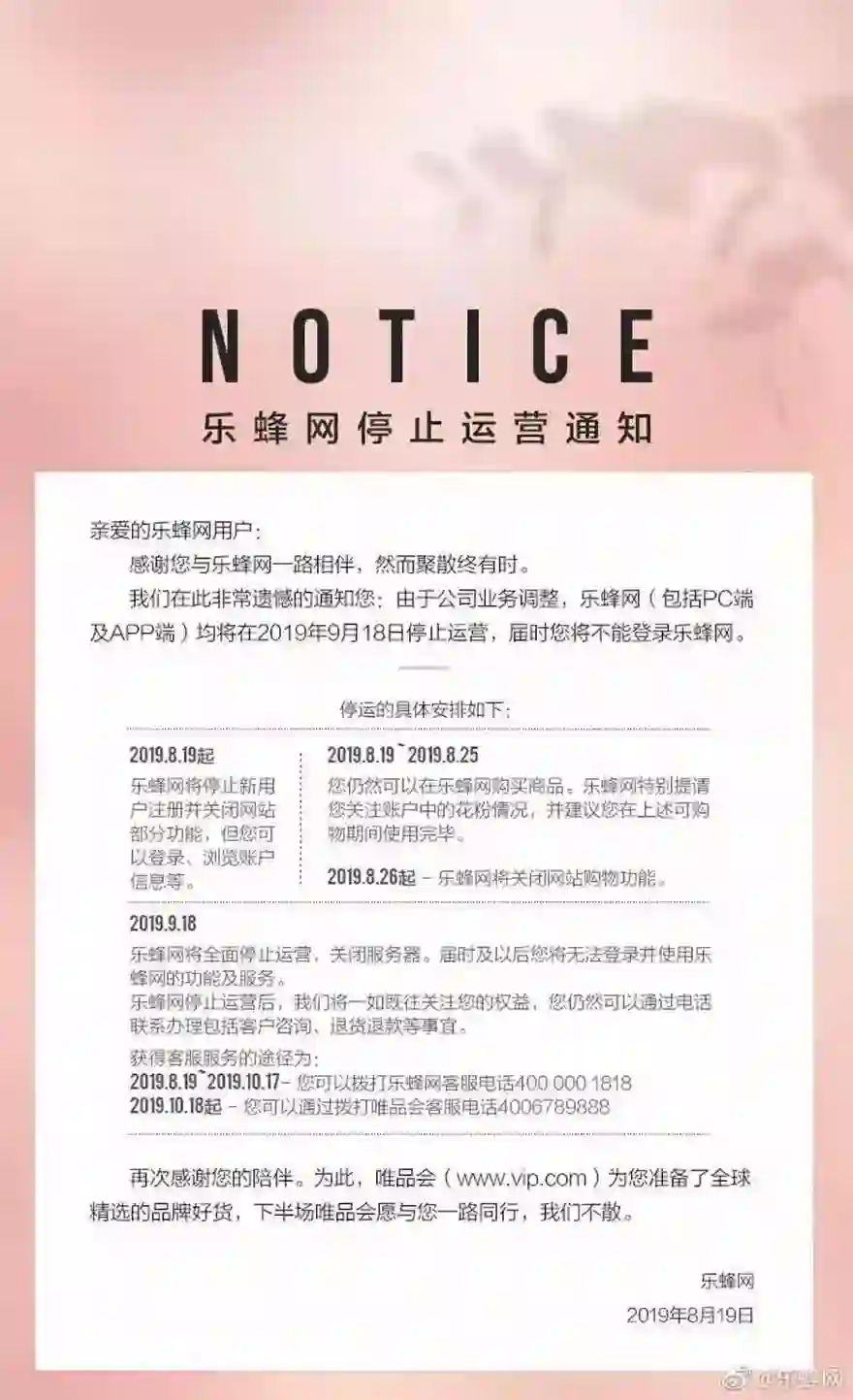 乐蜂网官方公众号也从即日起停止发布更新信息,并申请后台注销账号,给您带来的不便敬请见谅。